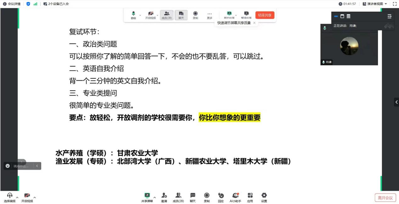 交流會上,董天舒、閆丫丫等研究生通過精心準備的PPT,系統(tǒng)講解了復試流程、面試技巧、材料準備及心態(tài)調整四大核心模塊。董天舒結合自身經(jīng)歷,強調“提前模擬面試”的必要性,建議考生通過錄制視頻復盤表達邏輯與儀態(tài)。閆丫丫針對“專業(yè)問答”環(huán)節(jié)提出“三步法”:梳理核心知識點、關聯(lián)科研熱點、總結個人見解,幫助考生構建系統(tǒng)性應答框架。高依恒與來文豪則聚焦PPT匯報要點,強調“內容精煉、邏輯清晰、突出科研潛力”,并分享了用圖表展示實驗成果的技巧。周華駿通過案例分析,鼓勵考生“揚長避短”,將本科經(jīng)歷與報考方向深度融合,展現(xiàn)綜合素養(yǎng)。輔導員楊湘虹從心理調適角度補充道:“復試是能力與心態(tài)的雙重考驗,考生需避免過度焦慮,可通過正念練習、模擬場景脫敏等方式增強自信。”