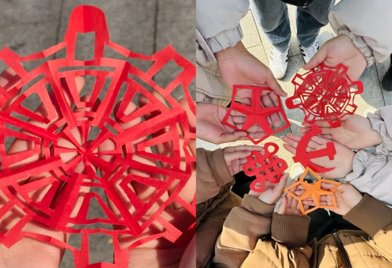 “窗花寄情·傳承經(jīng)典”環(huán)節(jié),則是一場(chǎng)藝術(shù)與情感的交融。在學(xué)院心育部成員的帶領(lǐng)下,大家手持剪刀、彩紙,圍繞“愛國(guó)”“傳承”“青春”主題,精心創(chuàng)作剪紙作品。黨徽、團(tuán)徽、五角星等圖案在指尖躍動(dòng),每一剪都蘊(yùn)含著對(duì)祖國(guó)的深情厚誼,每一張都承載著對(duì)紅色經(jīng)典的傳承與發(fā)揚(yáng)。
